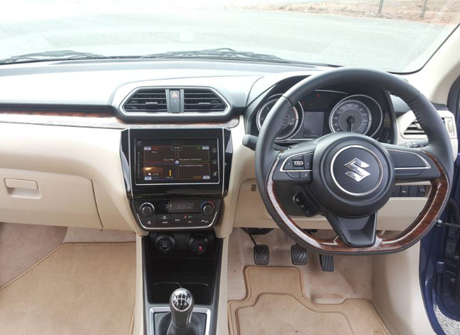 Step inside the cabin of the new Dzire and one instantly realises that this isn’t the cabin of another Maruti Suzuki car with a few new bits but is an all-new design instead. The dual-tone dashboard comprises of a black top while the lower part is beige. The wood finish in the dashboard and in the lower part of the flat-bottomed steering wheel adds to the premium appeal of the cabin significantly. This makes the Dzire the second compact sedan to have a flat-bottomed steering wheel after the Volkswagen Ameo.