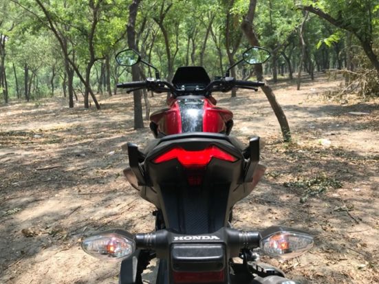Honda X-Blade offers a commuter style riding stance, with sensibly placed foot-pegs and a raised handlebar, which needless to say is comfortable for everyday usage. The positioning of the rear brake lever, however, had my right foot pointing to the sky. That may have been a bit of an exaggeration but it would’ve been nicer if it was slightly lowered.