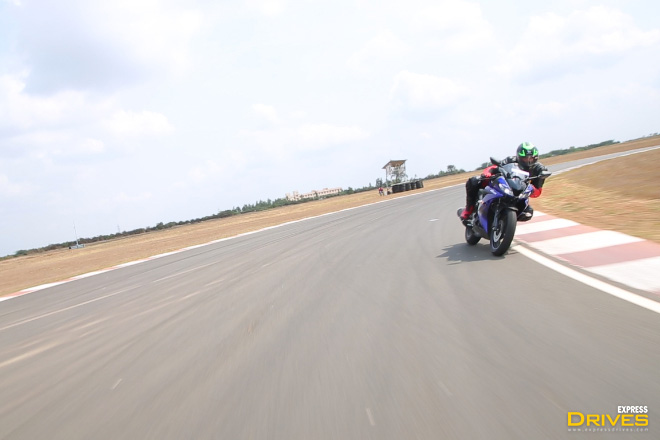 Now the Mounting points are the same but the Yamaha R15 v3 gets bigger disc brakes in front going from 263 mm to 282 mm on the V3. The rear still has a 220mm disc. ABS has NOT been included, but braking is still smooth & the slipper clutch helps for sure. Yamaha say they will put an ABS on the R15 by 2019, since by then laws making it mandatory will have come into place. Both brakes have more than enough bite. One thing’s for sure, it stops much faster than the V20. Gripping surfaces too have increased Yamaha have given both Tyres the upsize treatment. The front end gets a 100-80/17 tyre while the rear makes use of a 140-section shoe, identical to the R3. Tyres are MRF as stock. However Yamaha say that the best set up that they have found has an MRF upfront with a Metzeler in the back. This is the set up that we used on the track and the grip was phenomenal throughout.