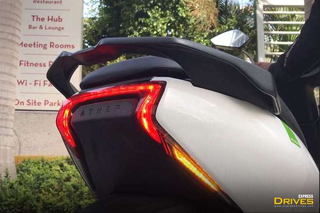 The Ather 450 has a quite futuristic design language and it stands out from the sea of other electric and petrol scooters currently on sale. The front end of the scooter gets an all LED headlamp fitted on the apron while the DRLs are integrated on the front cowl. The scooter looks striking in this light coloured shade with minimalistic graphics. In fact, the only ones you will find are Ather in green on the rear side panels and a 450 badge on the apron. The LED tail lamp looks simple yet appealing and the turn blinkers do look a class apart.