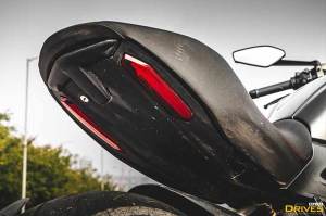 There’s no doubt that the Diavel 1260S in its black paint scheme with some red on the frame looks big and strong and spells aggression no matter how you look at it. The gold on the Ohlins forks looks darn good. It is all about moderation. Go ahead, use shiny gold or silver paint but if it’s in moderation, it’ll work. The giant headlamp casing with an LED lamp is only helping its case and so are the sleek tail lamps. The Diavel 1260S clearly has a hint of a superbike on its tail section and the Monster at the front.