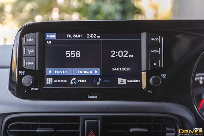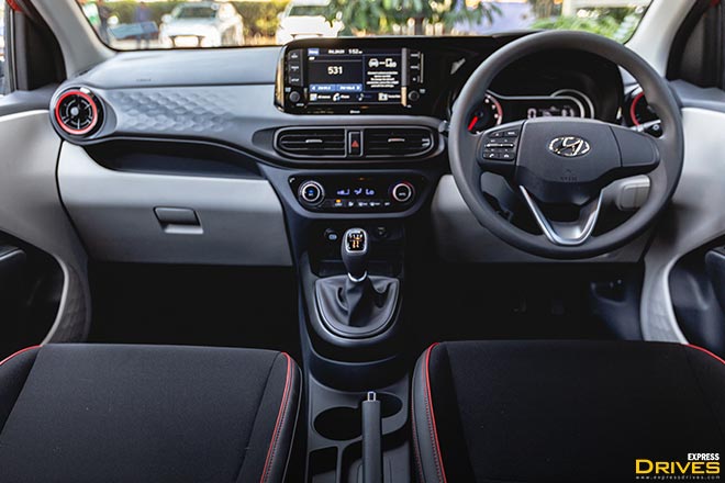 Moreover, on the turbo petrol variant, you get air-cons with red inserts that give a sporty character. On the other variants, you get silver accents which are more in line with the premium positioning of the car. There’s a familiar touchscreen infotainment system with Android Auto, Apple CarPlay connectivity. The touch response is good, the interface is simple, which is again similar to that of the Grand i10 Nios.