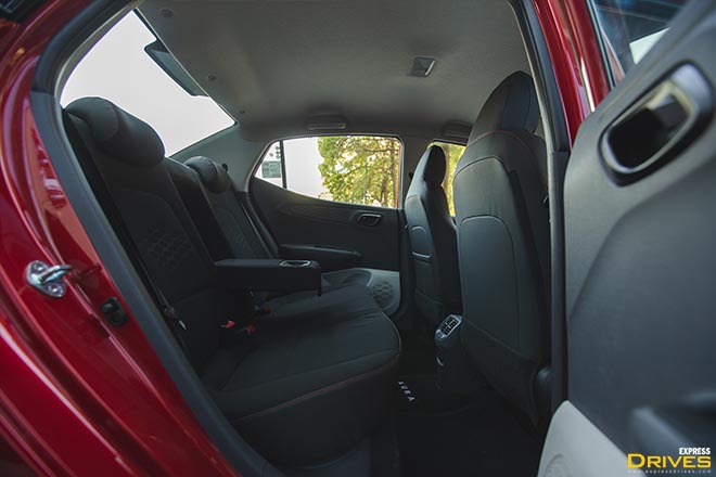 When it comes to seats, the Hyundai Aura scores well. These are nice and well-cushioned seats and offer good all-round support. The turbo variant gets black seats with red stitching and looks sporty as well. On the other hand, if you opt for any other petrol or diesel variant, you will get grey seats. Talking of the rear seats of the Aura, these are also a comfortable place to be in. With the driver’s seat adjusted to my preference, the rear seats offered good legroom and I also have the luxury of an almost flat floor so I can easily slide my feet underneath the front seat. Headroom is also good despite the sloping roofline and most people will not have problems with it.