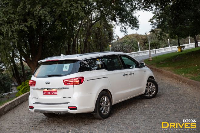 The side looks fine and the sheer size of the vehicle is what is the most appealing factor here. A slightly upswept window line around the C-pillar and the roof rail try to make things interesting successfully. Even the rear merges well with the rest of the design and the tail lamps look good while exuding an expensive feel overall. One thing, however, I would want to change is the extra blingy chrome alloy wheels. Kia doesn’t call it chrome but it does look exactly like chrome does and is too loud. Then again that’s just me and if you’re someone who loves chrome wheels then you’re in for a treat.