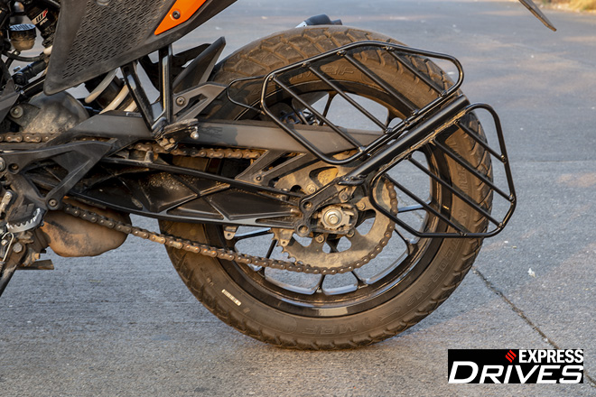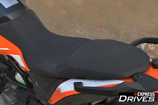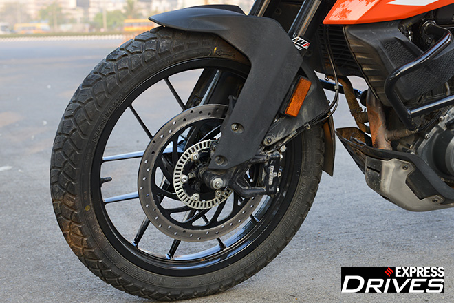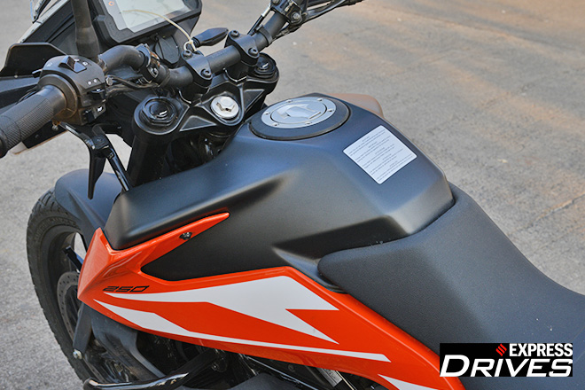 This KTM runs the same engine as the 250 Duke. The sprocketing has been altered to make the 30hp/24Nm, 250cc engine to give more mid as well as bottom-end punch. This being said, the bike isn’t quite happy at a higher gear and lower speed combination. You need to twist the throttle a bit more than you will, at all times. Third gear at 35kmph is something the bike is happy at whereas for speeds as low as 15kmph, first gear works. There is a slipper clutch provided for the 6-speed gearbox that minimises rear wheel hopping during aggressive downshifts. The clutch pull is quite light, however there is no adjustment here and neither is there any for the brake lever.