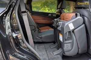 The only thing odd about the cabin is the old wiggly transmission with trans mode buttons that look out of place and old. The second-row seats on the Mahindra Alturas G4 only get bench seats and will not get the option of captain seats. There is a lot of space and the cabin is very roomy. The second row gets rear A/C vents with a USB and 12V charging slot for rear passengers. The seats can easily be folded by pulling up the lever to enter the third row. The third-row seats are recommended for kids and pets only. The SUV does feature A/C vents on the third-row seats and despite not having any glass opening on the C-Pillar one wouldn’t feel claustrophobic.