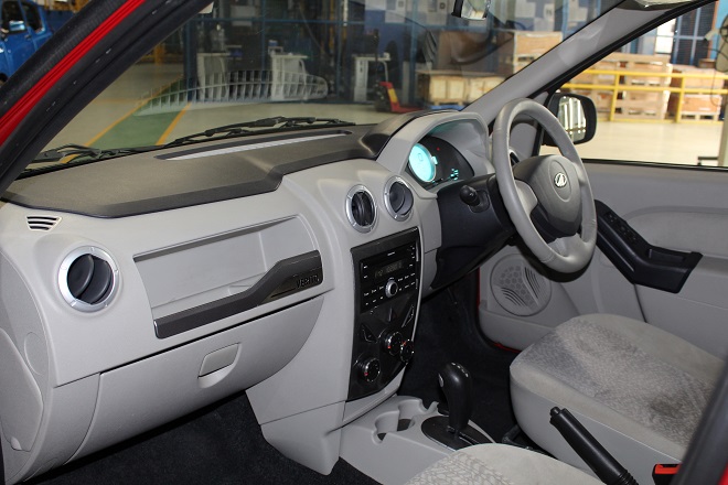 Mahindra e-Verito gets nice and spacious interiors with dashboard finished in grey-beige hard plastic. The round A/C vents too are finished in silver accents and some chrome is used on the e-Verito badge in front of the passenger’s seat. There could have been a better finish of the gear knob. The dashboard also features a 2-DIN Audio system that features a USB and AUX port. Mahindra e2o plus does get a proper infotainment system, but to save costs on the e-Verito Mahindra decided not to carry forward the unit used in E2o plus.