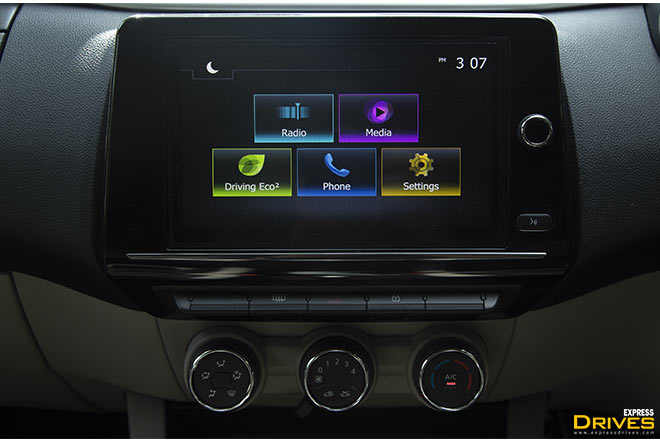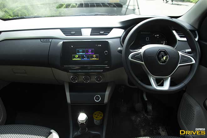 The Triber’s cabin has a newness to it. The black and grey theme looks good. You also notice the 8.0-inch touchscreen system that comes with an eco driving indicator as well as the usual Android Auto and Apple Carplay. Must say the touch sensitivity could have been better. In fact, in broad daylight, reading it seems a bit difficult on the move and changing tracks too. You see there are no steering mounted controls and the only thing one has to do is use the touchscreen infotainment. The instrument cluster is all-digital and in fact, there is no glass separating it from the user. It though is a bit hard to read on the move, especially as to which is the fuel gauge and the temperature one. This though is something, customers will get used to. There is a closed cavity near the handbrake and it has a cooling vent too. These will help keep those soft drinks cool. The door pockets too are wide enough to hold 1.0-litre water bottles.
