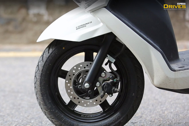 The stopping power to the Suzuki Burgman Street is delivered with the help of a disc brake up front along with a drum brake at the rear. While the front offers a good feedback, it lacks that instant bite and things may go for a toss under panic situations. The rear, on the other hand, works satisfactorily fine. Thankfully, a combined braking system is offered as standard with the Suzuki Burgman Street. For starters, the mechanism applies both brakes automatically when the rider presses the rear brake lever only, resulting in safer and enhanced braking.
