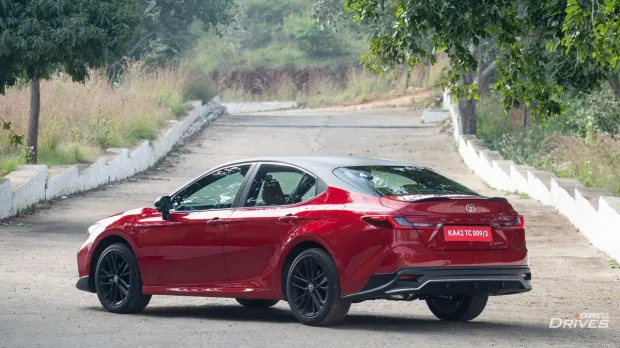Moving to the side, the sculpted shoulder lines, swooping roofline, and 18-inch alloy wheels make a powerful statement. At the rear, the elevated boot hood, C-shaped LED tail lamps, and bold Camry badging on the trunk lid complete the striking look. It’s busy, it’s bold, and it’s anything but understated.