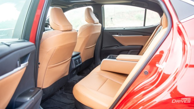 As expected, the Camry is loaded with features like a wireless phone charger, three Type-C ports, a generous under-armrest storage area, a 9-speaker JBL sound system, and a single-panel sunroof. Upgrades include a 10-way power-adjustable driver’s seat, the ability for rear passengers to slide or recline the front passenger seat, and a 10-inch head-up display. The front seats are spacious, comfortable, and equipped with lumbar support for added comfort.