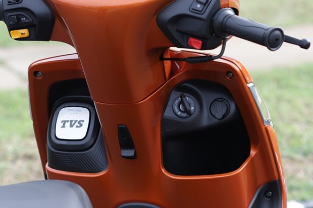 The TVS Jupiter 125 also comes with an all-in-one key slot. A normal twist to the left opens the underseat storage and when you press and twist the key to the right when it is in off position, the front external fuel fill lid pops out. That said, the Jupiter 125 is currently the only scooter in its class to offer an external fuel fill provision at the front. Near to that is a USB charger with a 2-litre glovebox that has more than enough space to keep your phone, wallet, sunglasses and even a one-litre water bottle.