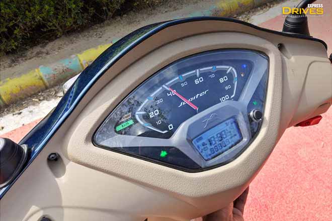 Furthermore, the updated instrument cluster looks modern, being a digital-analogue unit. The new cluster serves more information on board and some highlights include a clock, twin trip meters, service reminder and there is a small helmet indicator that reminds you to wear one when you get onto the scooter. Nice!