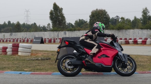 The F77 sprints 0-60kmph in just 3.1 seconds and if I wasn’t so busy smiling ear to ear, I would’ve timed it. Ultraviolette gave us this impeccable opportunity to test ride the F77 to our heart’s content on the Meco karting track in Bangalore and boy, is it fast. The electric bike gets three ride modes – Glide, Combat and Ballistic. No points for guessing that the Ballistic mode was everyone’s favourite for the sheer madness it holds. Yes, EVs are known for their ‘electric push’ and gush of power right from the get-go, but Ballistic just warps ahead. A clutchless, fast motorcycle mixed with a track that throws one hairpin bend after another tested its prowess. Weighing more than four times my weight, the F77 is light as a feature once it gets on the throttle. It pushes you to be fast and have fun at the same time.