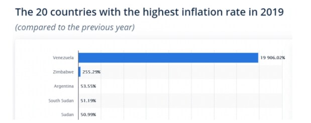 As per Statista’s most recent data, certain nations are struggling with hyperinflation, including Venezuela, which was rated first with a staggering inflation rate of 19,906% in 2019. Zimbabwe came in second after that with a rate of 255% inflation. Argentina was next, coming in third with a 53% inflation rate. Their respective currencies suffered as a result of increased inflation rates.