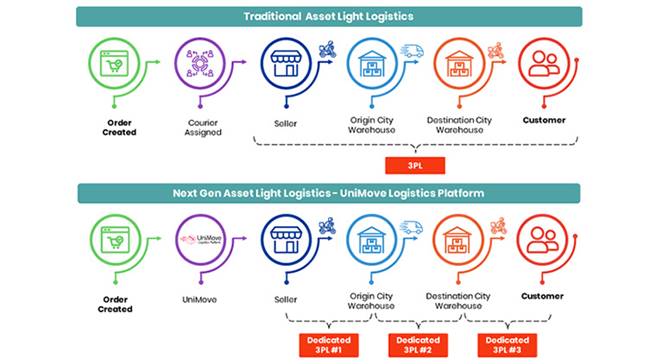 Under the traditional supply chain, a single 3PL manages the entire journey of a packet as it travels from the seller to the origin city hub (the first mile), from the origin city hub to the destination city hub (the mid-mile), and finally to the buyer’s home (the last mile).