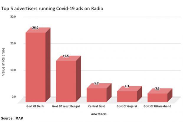 Even as the centre clocked high ad volumes, it was the Arvind Kejriwal led Delhi Government that seemed to have spent more money. The Delhi Government spent anywhere between Rs 73-75 crore in television advertising followed by Chief Minister Vijay Rupani led Gujarat Government at Rs 8-9 crore. Chief Minister Yogi Adityanath led Uttar Pradesh Government also spent Rs 7-8 crore for corona led campaigns on TV. The central government which includes the Ministry of Health and Family Welfare, Public Welfare Departments, among others spent Rs 4-5 crore. While TV clocked the maximum ads in terms of both volume and value, hot on the heels was radio which recorded advertising revenue worth Rs 50 – 60 crore. Meanwhile, governments spent in the range of Rs 9-10 crore on print.