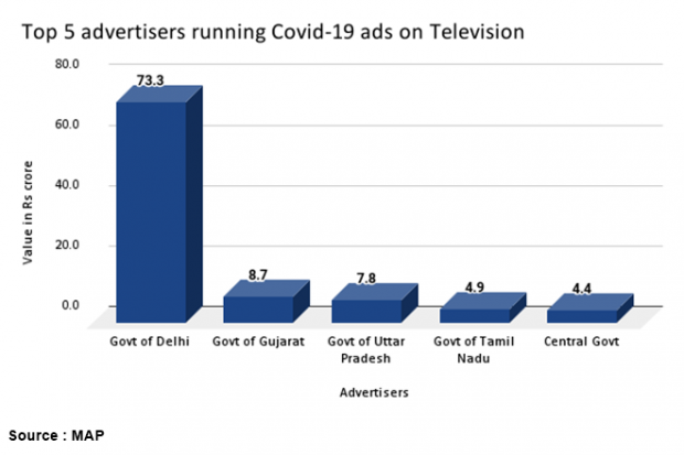 According to audience measurement firm, TAM Media Research, between March 2020 to June 2021, Covid-19 related messages on television accounted for 42% of total ad insertions under the social ads by government category. In this, the Narendra Modi led Central Government had the highest share of ad volumes, followed by the Delhi Government. Television as a medium clocked anywhere between Rs 98-100 crore between Mar’20-June’21 from the top state governments besides the central government.