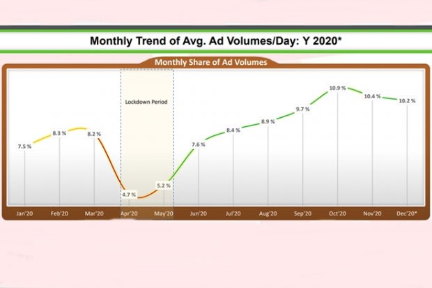 Despite covid wrecking havoc across the media and entertainment industry, ad volumes on television saw a marginal growth in 2020 when compared to 2019 while registering 26% growth when compared to 2016, according to the data released by AdEx India, a division of TAM Media Research. On the back of festive season, the ad volumes saw a rise this year as average ad volumes/day rose by 39% in fourth quarter (October-December) as compared to average ad volumes of the first three quarters. Due to a nation-wide lockdown, April- June quarter recorded the lowest average ad volumes/day.