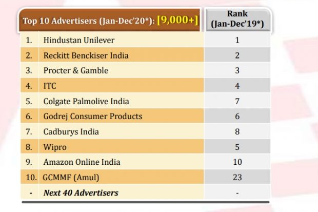 Unsurprisingly, FMCG players ruled the list of top 10 advertisers with Hindustan Unilever (HUL) leading the advertising charts, followed by Reckitt Benckiser India. Top 10 advertisers accounted for 45% share of ad volumes during 2020. Colgate Palmolive India, Cadburys India and Amazon Online India saw a positive rank shift this year as opposed to last year while GCMMF (Amul) was the new entrant in Top 10 advertisers’ list.