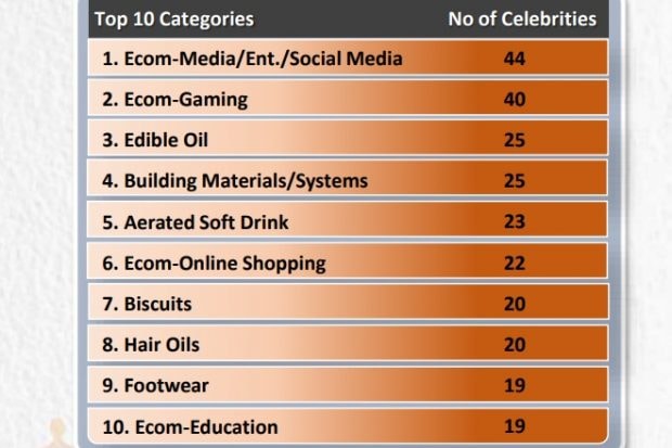 Ecom-Media/Ent./Social Media as a category saw the maximum celebrity from different profession endorsed brands under it. The category ran ads featuring over 44 celebrities. This was followed Ecom-gaming with 40 celebrities. Edible Oil and Building Materials/Systems category tied at the third place with 25 celebrities while aerated soft drink claimed the fifth sport with 20 celebrities under its belt.