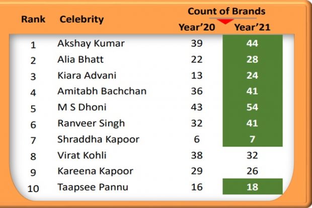Akshay Kumar emerged as the number one celebrity in terms of appearances during commercial advertisements with 9% share followed by Alia Bhatt. Virat Kohli, Shah Rukh Khan and Ranveer Singh maintained their ranking has ranked third this time. Akshay Kumar endorsed 44 brands in 2021 as opposed to 39 in 2020. As per the report, eight out of top 10 celebrities were endorsing more brands in 2021 when compared to 2020. These celebrities include Alia Bhatt, Kiara Advani, Amitabh Bachchan, M S Dhoni, Ranveer Singh, Shraddha Kapoor and Tapsee Pannu. While MS Dhoni was the top visible sports person in 2021.