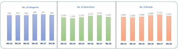 As per the data, week 26-28 (June 21 – July 11, 2020) registered a 7% rise in the average number of advertisers and brands compared to week 23-25 (May 31 – June 20, 2020). Out of this, week 27, witnessed the highest number of categories, brands and advertisers.