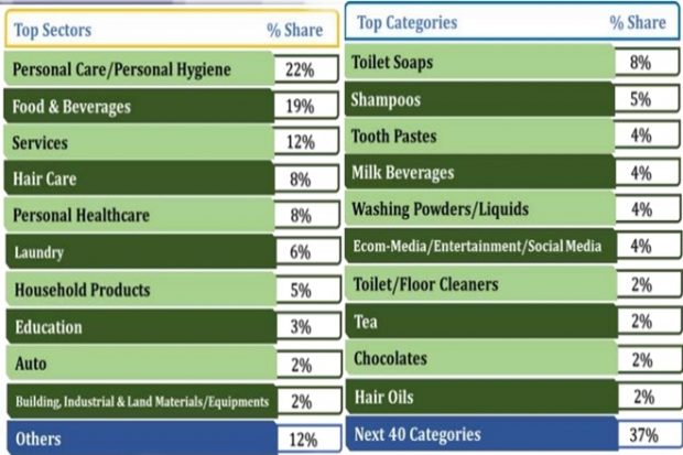 Unsurprisingly, ‘Personal Care/Personal Hygiene’ sector topped the charts to emerge as the most advertised sector with 22% share followed by the food and beverage (F&B) sector. Out of this, toilet soap category led the charts with 8% advertising share followed by shampoos at 5%. Milk beverage, Washing powder/liquid and ecom-media/entertainment/social media stood at the third, fourth and the fifth position with 4% share. Top 50 categories accounts for 75% share of TV ad volumes