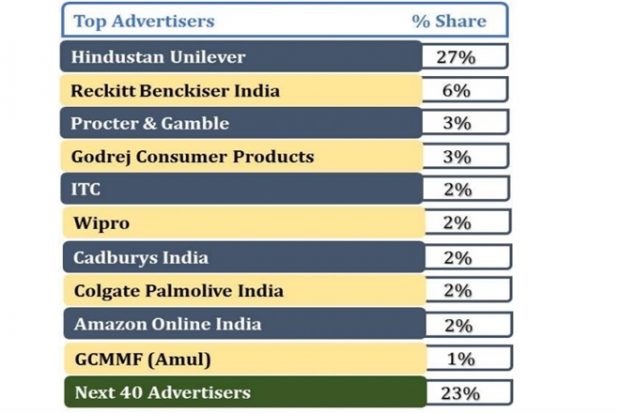 During week 23-28, the top 10 advertisers together accounted for 50% share of TV ad volumes. ‘HUL’ alone had more than 1/4th of the ad volume share with 27% share followed by Reckitt Benckiser with 6% share. The data reveals that over 680 advertisers have consistently advertised during week 23-28 on television.