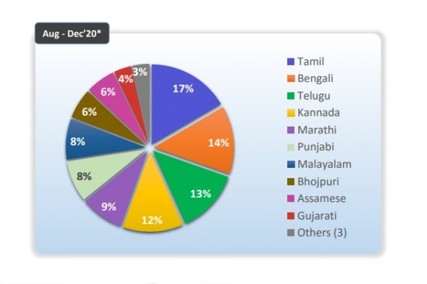 Tamil channels registered a 12% rise in average ad volumes per day during Aug-Dec’20 when compared to Aug-Dec’19, with the month of December registering the highest rise. Out of this, Tamil GEC genre topped the advertising charts with 42% share of the pie, followed by Tamil news with 24% share. However, during Aug-Dec’20, Tamil News genre saw highest growth of 31% in ad volumes followed by Tamil Movies with 25% rise compared to Aug-Dec’19. On the back of the viewership growth, number of advertisers and brands also rose by 5% and 4% respectively during Aug-Dec’20* compared to Aug-Dec’19*.