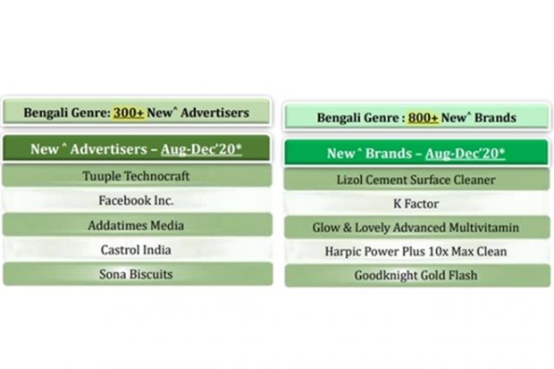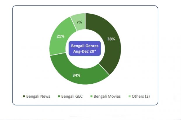 Average ad volumes on Bengali channels grew by 8% in Aug-Dec’20 when compared to Aug-Dec’19, with October’20 recording the highest ad volume rise of 14%. Out of this, Bengali News emerged on top of the advertising charts with 38% share of Bengali genres’ ad volumes in Aug-Dec’20 displacing Bengali GEC compared to Aug-Dec’19. The top two Bengali channel genres accounted for 72% share of ad volumes.