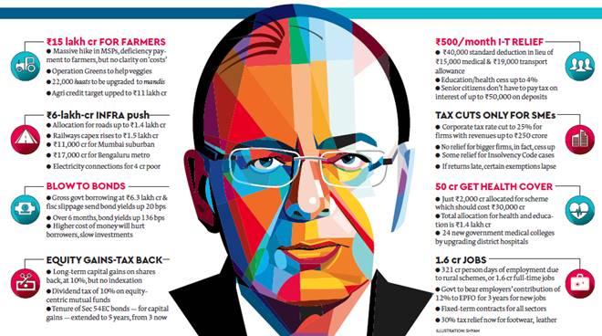 In the largesse to the farm sector, the government offered to keep minimum support prices for select kharif crops to be one and half times the “production cost”, a move that would help address rural distress and boost consumption but has the potential to fan inflation. Jaitely also announced a mammoth National Health Protection Scheme that could bring 50 crore people under health insurance cover — barring Rs 2,000 crore provided under the existing Rashtriya Swasthya Bima Yojana, the Budget has no outlay for this, though. In steps aimed at boosting job creation, the minister extended the benefit of government contributing 12% of employer’s share of employee’s provident fund for new employees to all sectors for the next three years — the scheme is currently limited to textiles and leather industries. More importantly, the facility of fixed-term employment, which allows textiles and leather units considerable labour market flexibility without harming workers’ interests, has been extended to all sectors.