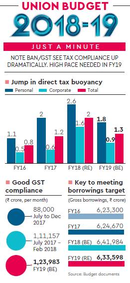 The Centre has targeted a 16.6% increase in tax receipts next year, against 15.3% in the current fiscal. GST, which will be the single largest tax revenue source for the Centre in FY19, accounting for 23% of receipts, is estimated to garner Rs 7.4 lakh crore for it in the next fiscal, which means the combined receipts from this tax for the Centre and states in the year will be double that amount, or Rs 1.25 lakh crore a month. Although it is certain that GST revenues will pick up as this comprehensive indirect tax — which is widening the tax base and reducing evasion — stabilises, the estimate seems to be a bit ambitious, given that average monthly GST collections so far have been around Rs 88,000 crore.