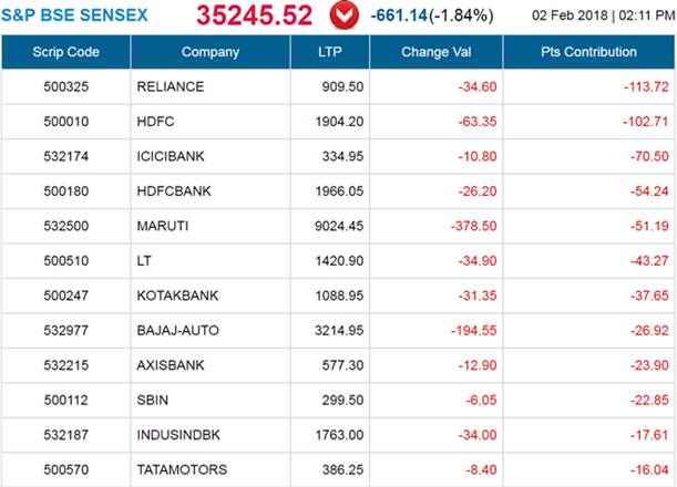 Indian equities came under pressure after the Budget 2018 with headline indices Sensex and Nifty losing nearly 2% led by a plunge in the shares of heavyweight companies such as Reliance Industries, HDFC, ICICI Bank, L&T, Maruti Suzuki, HDFC Bank, Kotak Mahindra Bank, Bajaj Auto, Axis Bank, IndusInd Bank, State Bank of India and Tata Motors. Collectively, these 12 shares alone washed off as much as 580 points out of the 661-point drop in the Sensex index.