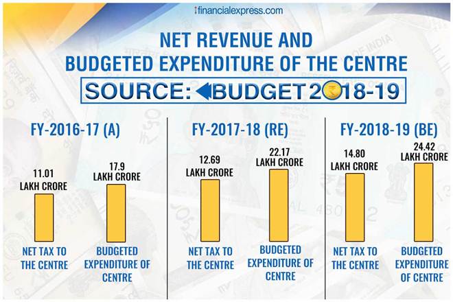 As per the revised estimates for FY 2017-18, the centre’s net tax collection rose by 15.25% to Rs 12.69 lakh crore whereas its total expenditure through budget rose to Rs 22.17 lakh crore which was 174.7% of the net revenues collected by the centre that year.