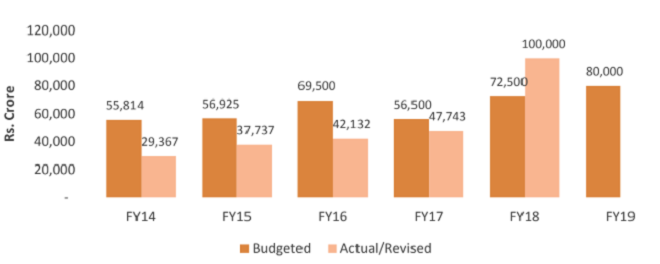 The government is expected to fall short of disinvestment target by Rs 20,000 crore, a recent report by Care Ratings said. Data show that in the last five years, the government has failed to meet disinvestment targets every year, with FY18 being an exception. “In an average, the government has achieved nearly 65% of the budgeted disinvestment during FY14 – FY17,” the report said.