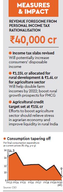 This encourages consumption over savings in the near term.” Reviving rural demand is crucial to reigniting consumer sentiment. The Budget says it will put aside Rs 2.83 lakh crore for the agriculture sector, of which Rs 1.23 lakh crore has been allocated for rural development. “This thrust on agriculture, irrigation and rural development should fuel growth in a struggling rural economy,” said Vivek Karve, CFO, Marico Limited. However, not all sectors have benefited. “More favourable announcements for other sectors such as real estate and auto, which are not faring well at the moment, would have further helped improve spending,” said Wahi.