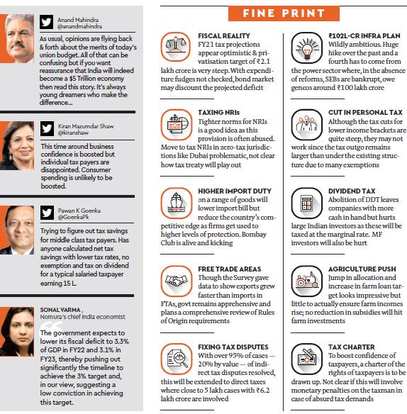 The Budget completed the project of aligning India’s corporate tax regime with the most benign among major economies by removing the levy of dividend distribution tax in the hands of firms. The move with estimated revenue impact of Rs 25,000 crore could increase foreign investors’ returns from investments in Indian companies. The minister invoked an exigency clause to enable deviations of 0.5% of GDP each from the fiscal road map for both FY20 and FY21 —the fiscal deficits for the two years would therefore be 3.8% and 3.5%, respectively. If one goes by the relevant rules, there aren’t circumstances to warrant the trigger, so the act was actually presumptuous. However, even with this step, the Centre’s Budget size relative to GDP would rise only marginally from 13.2% in FY20 to 13.5% in FY21.