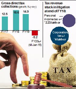 Although latest amount stuck in disputes between the taxman and the taxpayer in the direct tax arena isn’t known, the disputed amount was revealed to be a whopping Rs 6.23 lakh crore at the end of FY18, including Rs 4 lakh crore locked up over corporate tax disputes. While demonetisation helped boost personal income tax collections — the mop-up grew 22% in FY17 —that proved to be a blip and the growth has since fallen steeply. The government has had only modest success so far in proving the unmet tax liabilities of those who deposited huge amounts of cash in banks during demonetisation.
