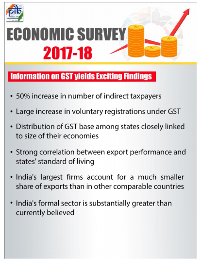 The highlights of the economic survey relating to GST were there has been a 50% increase in number of indirect taxpayers; Large increase in voluntary registrations; distribution of GST base closely linked to size of economies; strong correlation between export performance and state’s standard of living and India’s formal sector was found to be substantially greater than currently believed.