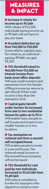 Stand-in finance minister Piyush Goyal in his Budget speech extended the tax rebate to Rs5 lakh taxable income from Rs3.5 lakh earlier. Earlier, the rebate worked out to Rs2,500/annum for an eligible taxpayer; it would now lead to a saving of Rs12,500/ annum even as the eligibility for availing the benefit gets extended.