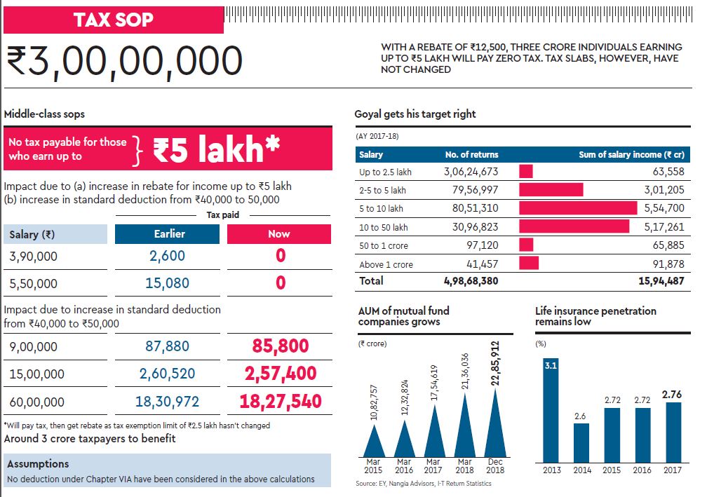 Middle-CLASS households will have a little more to spend in 2019-20 with the tax rebate (Section 87A) threshold for the levy of income tax having been raised to Rs5 lakh. The change in the limit will save middle-class individual assessees Rs10,000 a year each; the total relief, across three crore individuals, is around Rs18,500 crore.