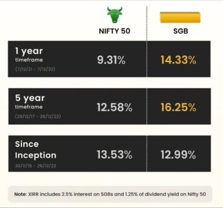 Sovereign Gold Bond: India has a unique product known as a Sovereign Gold Bond or SGB where the government offers a Gold Bond instead of physical gold, also known as paper gold by many. The bond pays a 2.5% coupon payable bi-annually. At the end of the tenure, the investor can redeem the bond at the prevailing gold rate. This is a win-win situation for all stakeholders. The government can help wean off Indians’ habits of perpetually buying physical gold. What’s more, the gains and the interest earned are tax-exempt if the bond is held till maturity. This move of the government has found a strong response as the government has issued SGBs worth over Rs 30,000 cr since its inception in 2015. Let’s take a look at the returns of the SGB vs Nifty 50 index. Equities are much more volatile than gold, plus there is an LTCG tax payable after a threshold. The only downside is that these bonds have a lock-in and the trades are often illiquid.