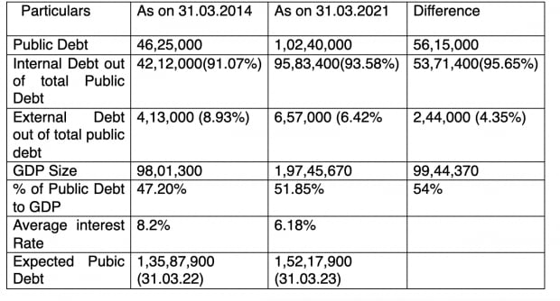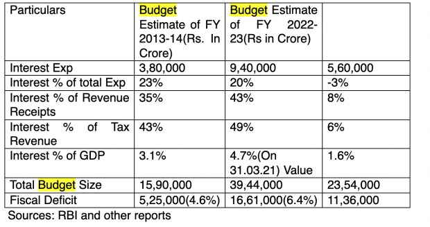 The most alarming aspect of this budget is exponential increase in interest expenditure. When the Modi government took over the reins of the country in 2014, the estimated interest expenses in the budget were around Rs 3.80 lakh crore, whereas the estimated interest outgo for the financial year 2022–23 is Rs 9.40 lakh crore. It implies that interest expenses have almost tripled in the span of nine years. The interest amount, prima facie, seems to be phenomenal in terms of value, but is that a reality? We often hear from experts in the economic and political arena that this government has ruined the economy and we are heading towards financial bankruptcy. It is a general understanding that one should keep the interest burden low to sail through the rough waters, but whether this belief is really tenable in every situation?