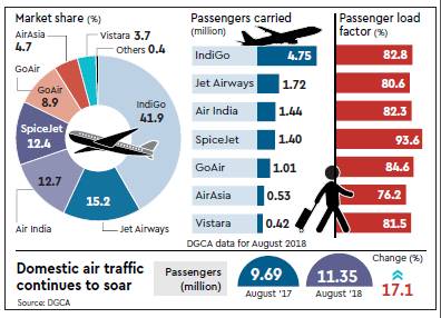 The top five airlines — IndiGo, Jet Airways, Air India, SpiceJet and GoAir — flew with load factors between 80.6% and 93.6%.