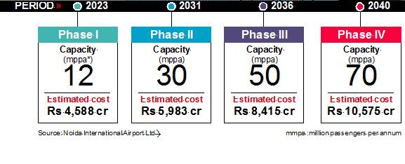 Implementation of the Rs 29,561-cr project would take place in four phases, with the last phase scheduled for completion by 2040. When fully operational, the Jewar airport in Greater Noida would be able to handle over 160 million passengers per annum (mppa), making it the largest airport in India. While the Indira Gandhi International (IGI) Airport in New Delhi has a present capacity of around 70 mppa, it is going to increase to