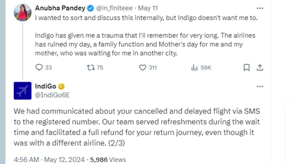 In reply to her posts, IndiGo wrote that the passengers had been informed of the delays and cancellations of flights via SMS on their mobile numbers, adding they initiated a full refund of the return journey.