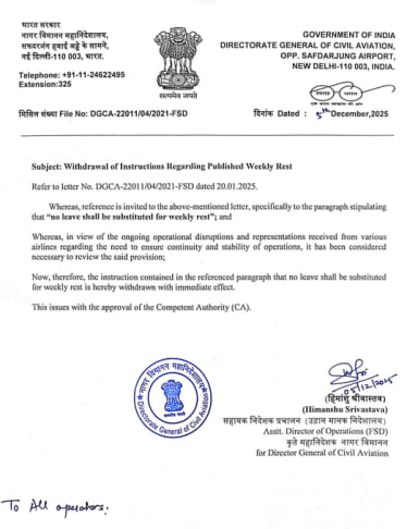 The Directorate General of Civil Aviation (DGCA) has withdrawn the instructions to all operators regarding Weekly Rest for crew members.