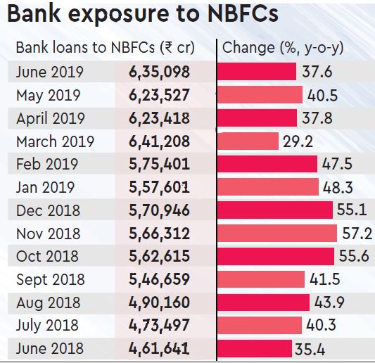 Credit outstanding to NBFCs stood at Rs 6.35 lakh crore in June 2019, up 38% from a year ago, show latest data released by the Reserve Bank of India (RBI). Indeed, the increase in loans outstanding to NBFCs has been upwards of 35% year-on-year (y-o-y) throughout the first quarter of FY20.