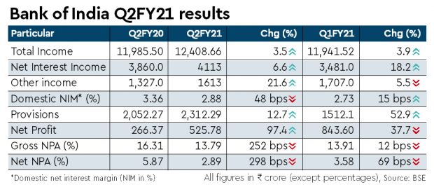 Public sector lender Bank of India (BoI) on Friday reported a net profit of Rs 526 crore in the September quarter of FY21, up 97% year on year (YoY), owing to a 22% rise in other income on a year-on-year basis to Rs 1,613 crore. Profit growth was supported by net interest income (NII), which rose 6.6% YoY to Rs 4,113 crore.